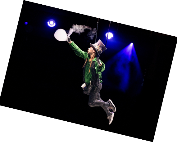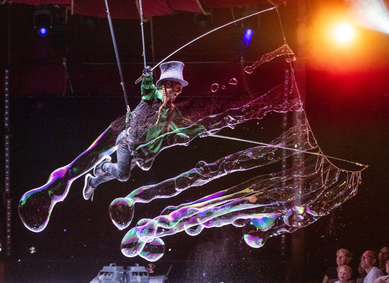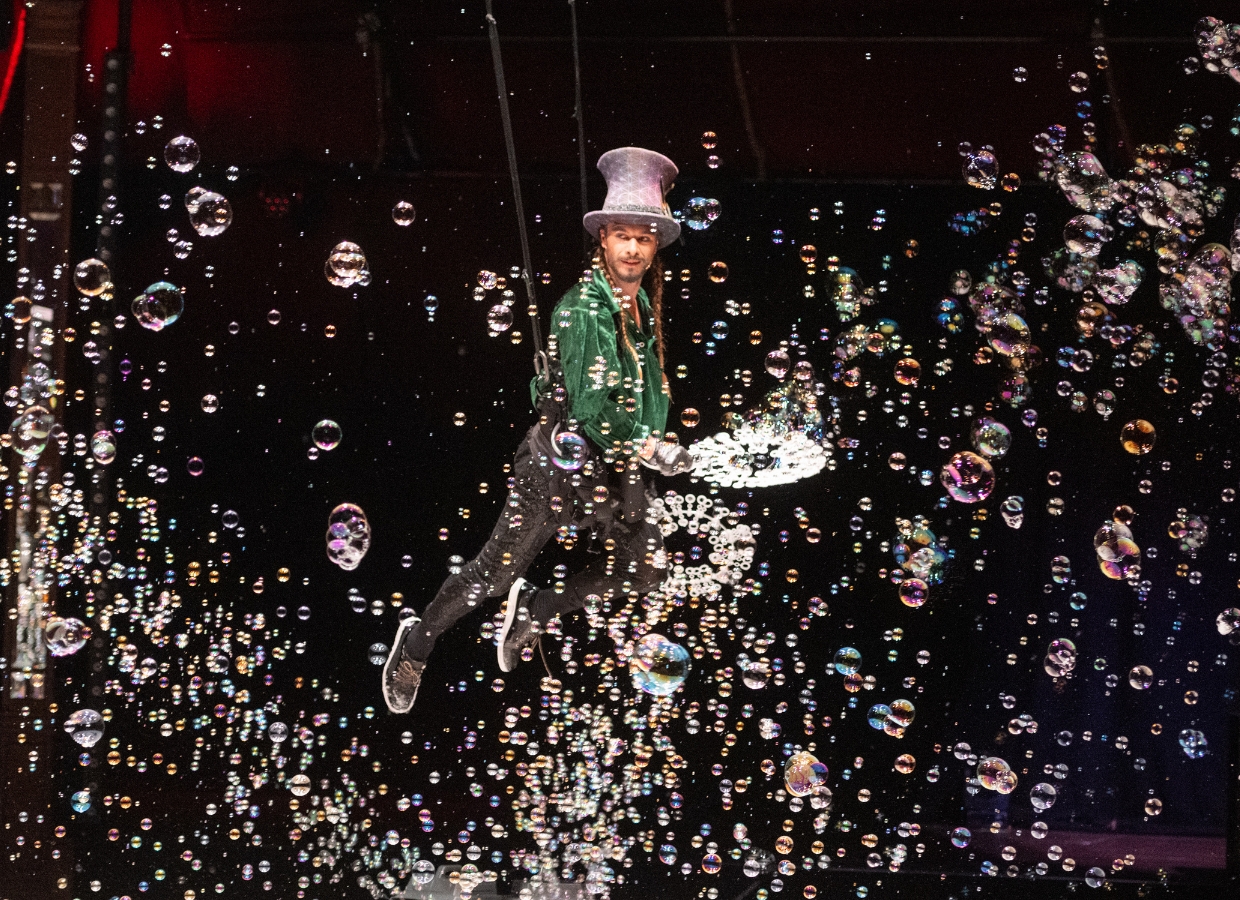 “The spectacle of Maxwell whooshing above the stage whilst conjuring an avalanche of bubbles was enthralling. His skill in manipulating the bubbles is amazing”